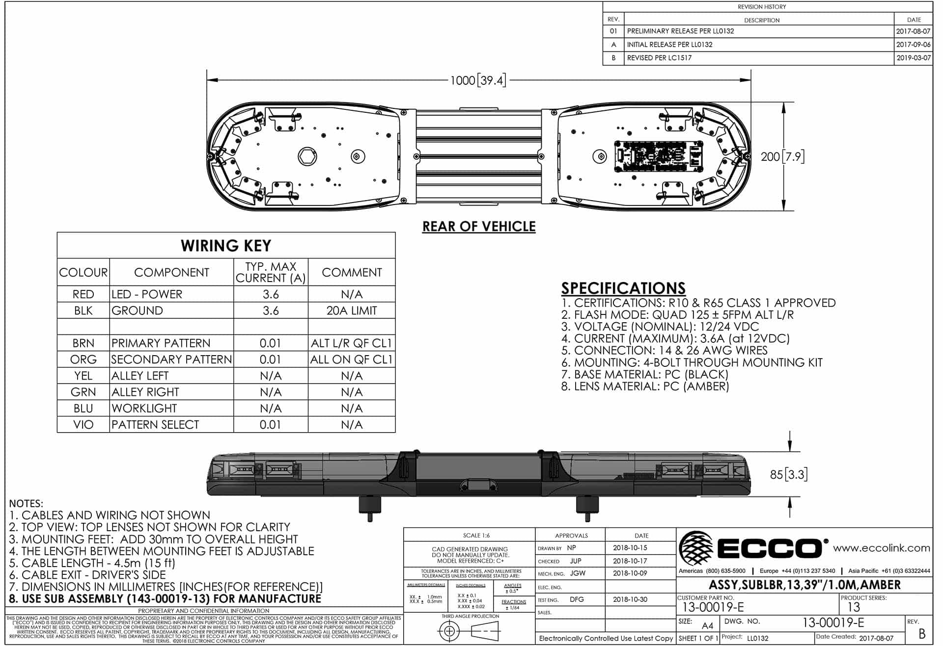 Der ECCO ESG 13 serie Ecco ist ein LED Leuchtbalk für Signalanwendungen an Fahrzeugen im Spannungsbereich von 12-24 V. Mit einer Länge von 1000 mm und einem robusten Gehäuse aluminium bietet dieser Leuchtbalk eine zuverlässige Sichtbarkeit unter verschiedenen Arbeitsbedingungen. Die Linse besteht aus schlagfestem Polycarbonat und die Montage ist dank eines frei verstellbaren Bügels flexibel. Der Anschluss erfolgt über ein offenes Kabelende mit einer Kabellänge von 450 cm, das sich für verschiedene Aufputz-Montageszenarien eignet.
