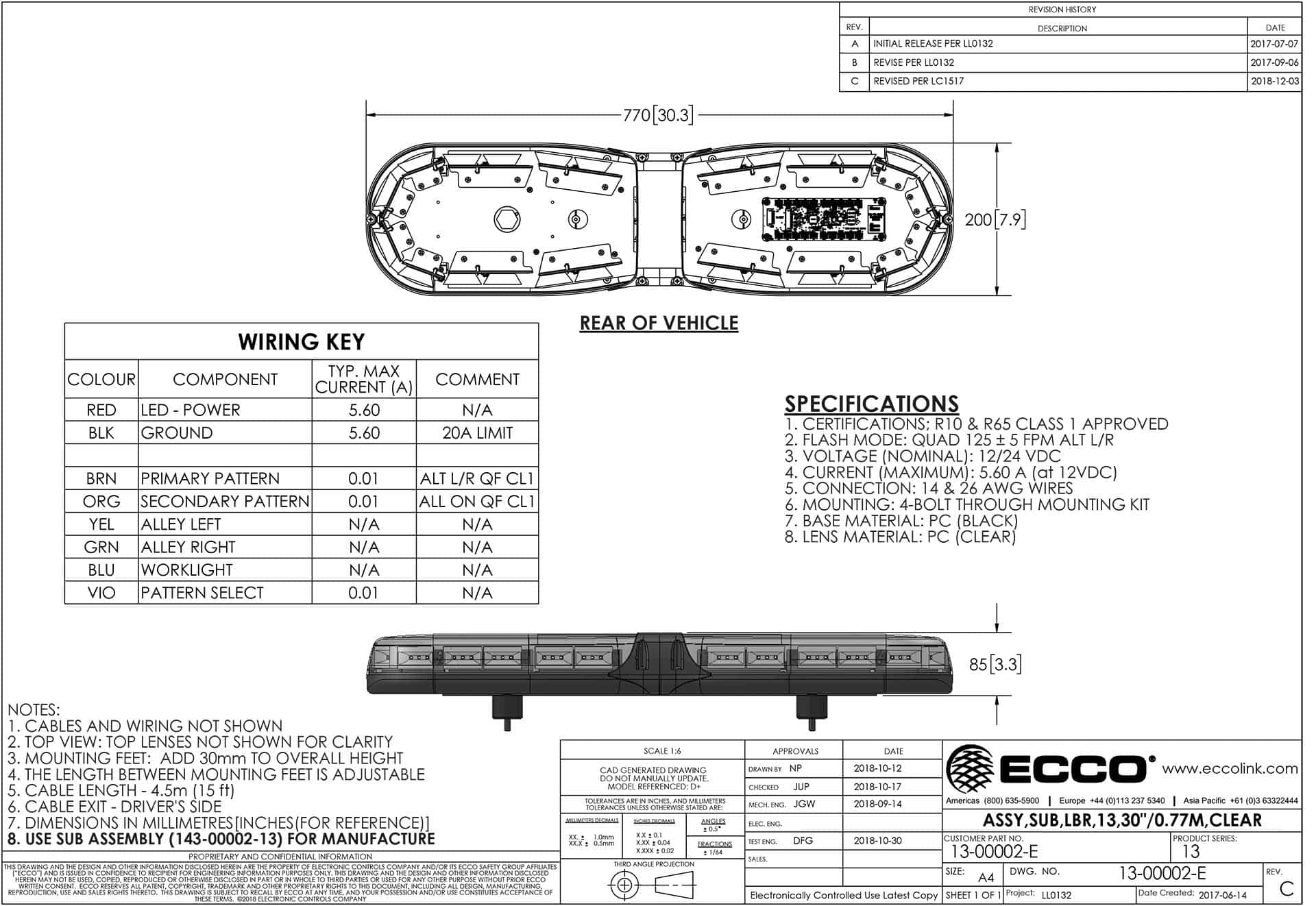 Dieses Modell hat eine Gesamtlänge von 770x200x85 mm und ist mit einem 450 cm langen Kabel mit offenem Kabelende ausgestattet. Die ECCO ESG 13 Serie erfüllt die Zertifizierungen CE, ECE-R10 und ECE-R65Class1, was bedeutet, dass das Produkt die elektromagnetische Verträglichkeit und die Sichtbarkeit gemäß den relevanten Richtlinien gewährleistet. Der Leuchtbalk wurde in Großbritannien entwickelt und wird mit einer fünfjährigen Garantie geliefert.