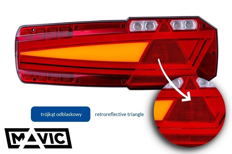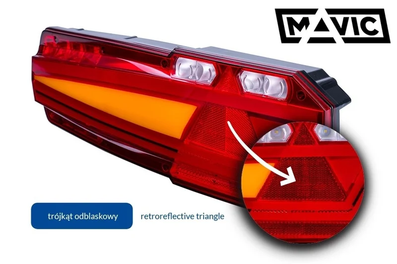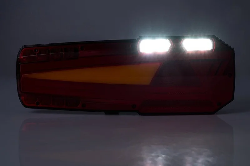 Dieses Rücklicht vereint die Funktionen: Rücklicht, Bremslicht, Blinklicht, dynamisches Blinklicht, Nebelscheinwerfer, Rückfahrlicht und Kennzeichenbeleuchtung. Darüber hinaus verfügt das Gerät über einen Reflektor, der die Sichtbarkeit erhöht. Das Gerät entspricht IP68 und ist nach CE, ECE-R10, ECE-R148 und ECE-R150 zertifiziert.