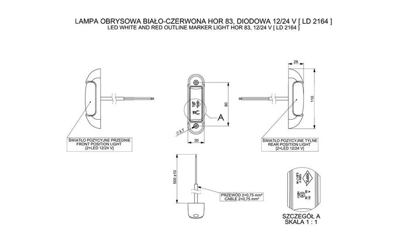 Das Gehäuse aus Gummi in Kombination mit einer Linse aus Polycarbonat bietet eine robuste Konstruktion für den langfristigen Einsatz, auch unter rauen Bedingungen. Mit einer kompakten Größe von 110x28x30 mm und der Aufbaumontage ist die Installation platzsparend und einfach. Die Begrenzungsleuchte ist mit einem 50 cm langen Kabel mit offenem Kabelende ausgestattet. Dieses Modell verfügt über die Zertifizierungen CE, ECE R10 und ECE R7 und erfüllt die Schutzklasse IP68.