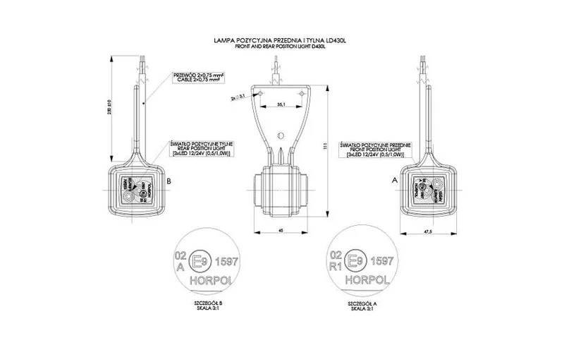 Die LED Begrenzungsleuchte strahlt rotes und weißes Licht aus und erfüllt die Funktion hinter Umrissleuchten. Die Schutzart IP68 und die Zertifizierung nach CE, ECE-R10 und ECE-R7 unterstreichen seine Eignung für den professionellen Einsatz. Das 20 cm lange Stromkabel mit offenem Kabelende ermöglicht den direkten Anschluss innerhalb bestehender Installationen.