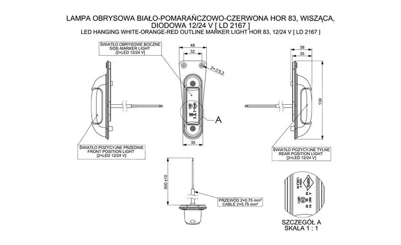 Diese LED Begrenzungsleuchte aus der MB-5300 serie Horpol ist für die Montage an der rechten Seite von Fahrzeugen mit 12-24V-Bordnetz konzipiert. Dank der Kombination aus roten, weißen und amberfarbenen LED dient die Lampe sowohl als Umrissleuchte als auch als Seitenmarkierungsleuchte. Mit einer kompakten Größe von 139x38x48 mm ist diese Begrenzungsleuchte für Anwendungen mit begrenztem Einbauraum geeignet.