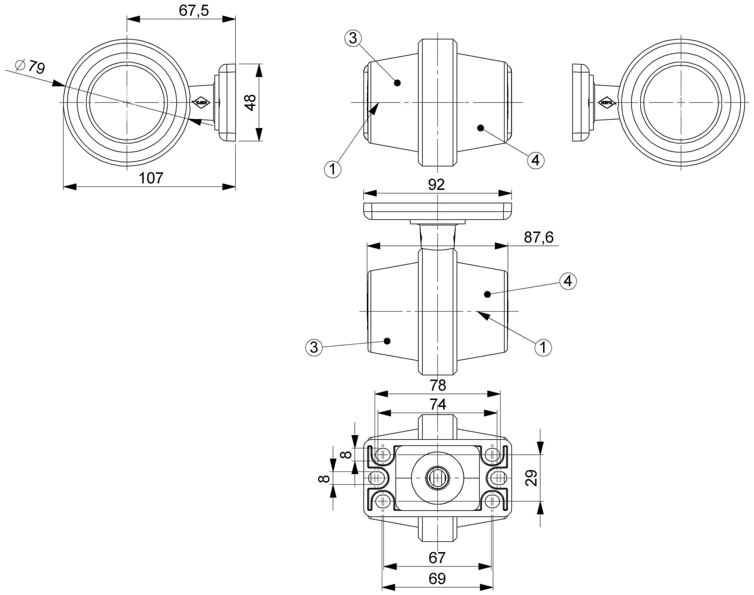 Rechts | LED Begrenzungsleuchte | abgewinkelter Griff | 12-36v | 0,75mm². Stecker | M10BV-312RW