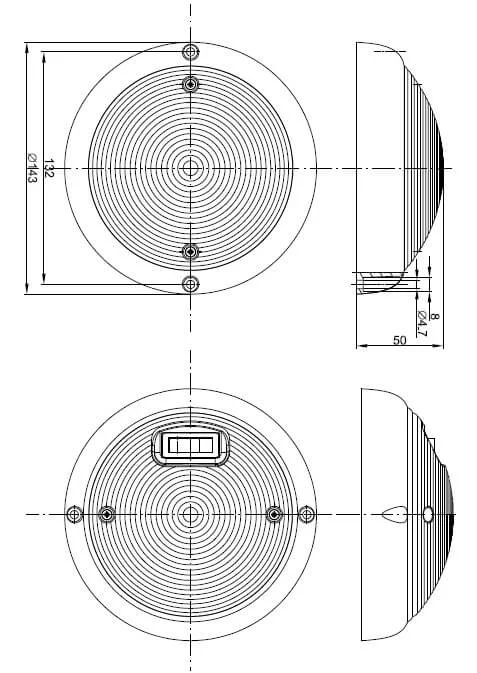 Die B10-serie Fristom B10-serie umfasst LED Innenbeleuchtungen für den Fahrzeuginnenraum in 12-24 V Systemen. Dieses Modell, die B10GS-143Z, zeichnet sich durch ein rundes Aufbaudesign mit einem Durchmesser von 143 mm und einer Höhe von 50 mm aus. Das Gehäuse und die Linse sind aus Polycarbonat gefertigt, was zur Stoßfestigkeit und Langlebigkeit beiträgt.