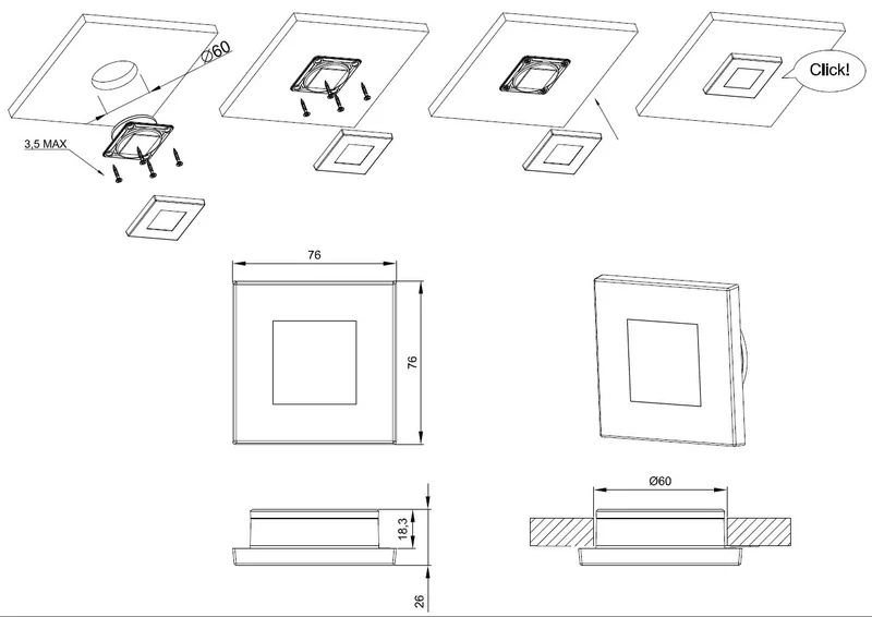 Die runde Version misst 76x76x26 mm und wird mit einem ABS-Gehäuse hergestellt. Der Anschluss erfolgt über ein offenes Kabelende mit einer Kabellänge von 10 cm. Die Wasserdichtigkeitsklasse ist mit ‚WATERPROOF‘ angegeben. Die Lampe entspricht der CE-Richtlinie. Dieses Modell ist nicht mit zusätzlichen Lichtfunktionen ausgestattet.