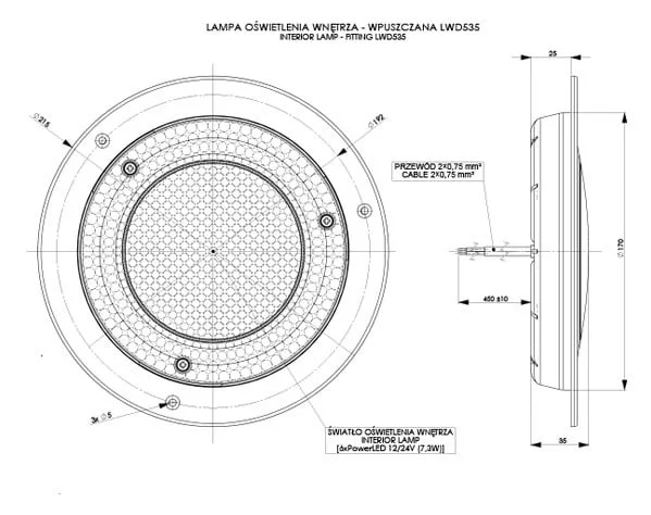 Die B-1700 serie von Horpol umfasst eine LED Innenbeleuchtung, die für den Einsatz in Fahrzeugen mit einem Spannungsbereich von 12-24V geeignet ist. Dank ihres neutralweißen Lichts von 4000K sorgt sie für eine helle und naturgetreue Farbwiedergabe im Innenraum. Das Modell BG-1700W ist für die Einbaumontage konzipiert und wird mit einem weißen oder schwarzen Montagering geliefert, so dass die Oberfläche an das Fahrzeuginterieur angepasst werden kann.