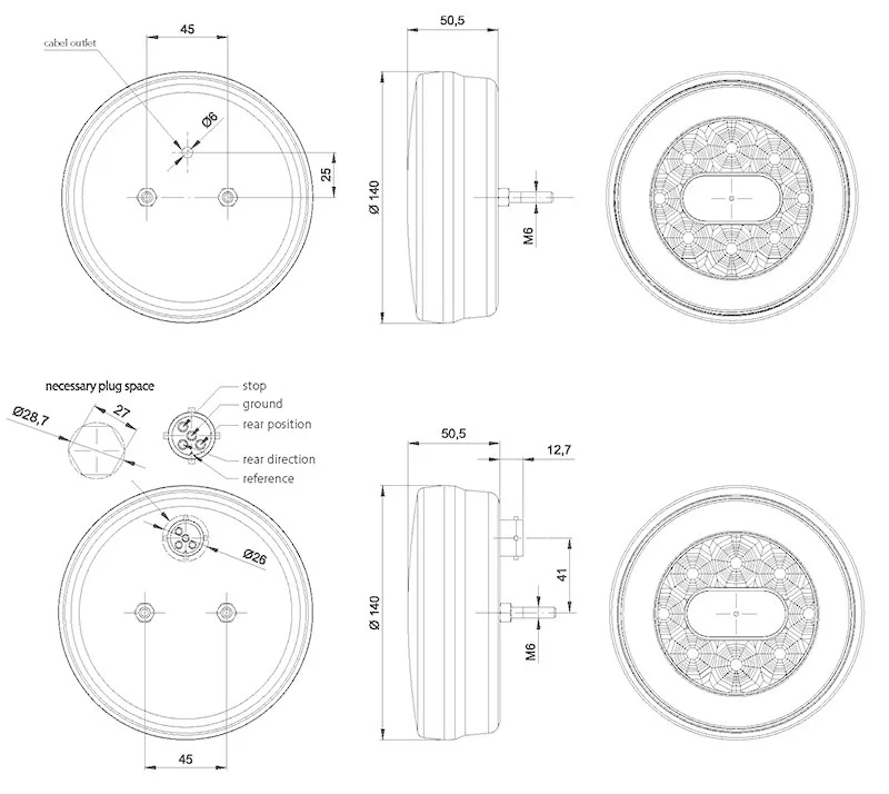 Dieses runde LED Rücklicht aus der Fristom 800-serie ist für Fahrzeuge mit einem Spannungsbereich von 12-24 V geeignet. Das Modell ist für die Aufbaumontage konzipiert und verfügt über ein offenes Kabelende mit 100 cm Kabellänge. Die Konstruktion besteht aus einem schlagfesten Gehäuse aus Polycarbonat mit einer Linse aus Polycarbonat im Format ø140 x 50,5 mm. Dieses Rücklicht kombiniert die Funktionen: Rücklicht, Bremslicht und Blinklicht. Dank der IP68-Zertifizierung ist dieses Produkt staub- und wasserdicht. Die Konformität mit CE, ECE R10, ECE R7 und ECE R6 unterstützt den Einsatz auf öffentlichen Straßen.