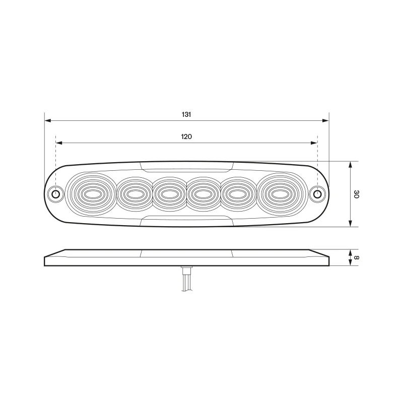 Dieses LED Rücklicht wird mit einem 25 cm langen Kabel geliefert und verfügt über ein offenes Kabelende. Das Modell wird mit 12-24V betrieben und ist somit mit verschiedenen Fahrzeuginstallationen kompatibel. Mit seinen kompakten Abmessungen von 131 x 30 x 8 mm ist dieses Modell besonders für die Montage in engen Räumen geeignet. Seine IP67-Einstufung bietet Schutz gegen Staub und vorübergehendes Eintauchen in Wasser. Das Produkt erfüllt die Anforderungen von CE, ECE-R10 und ECE-R38 für EMV- und Straßenanwendungen.