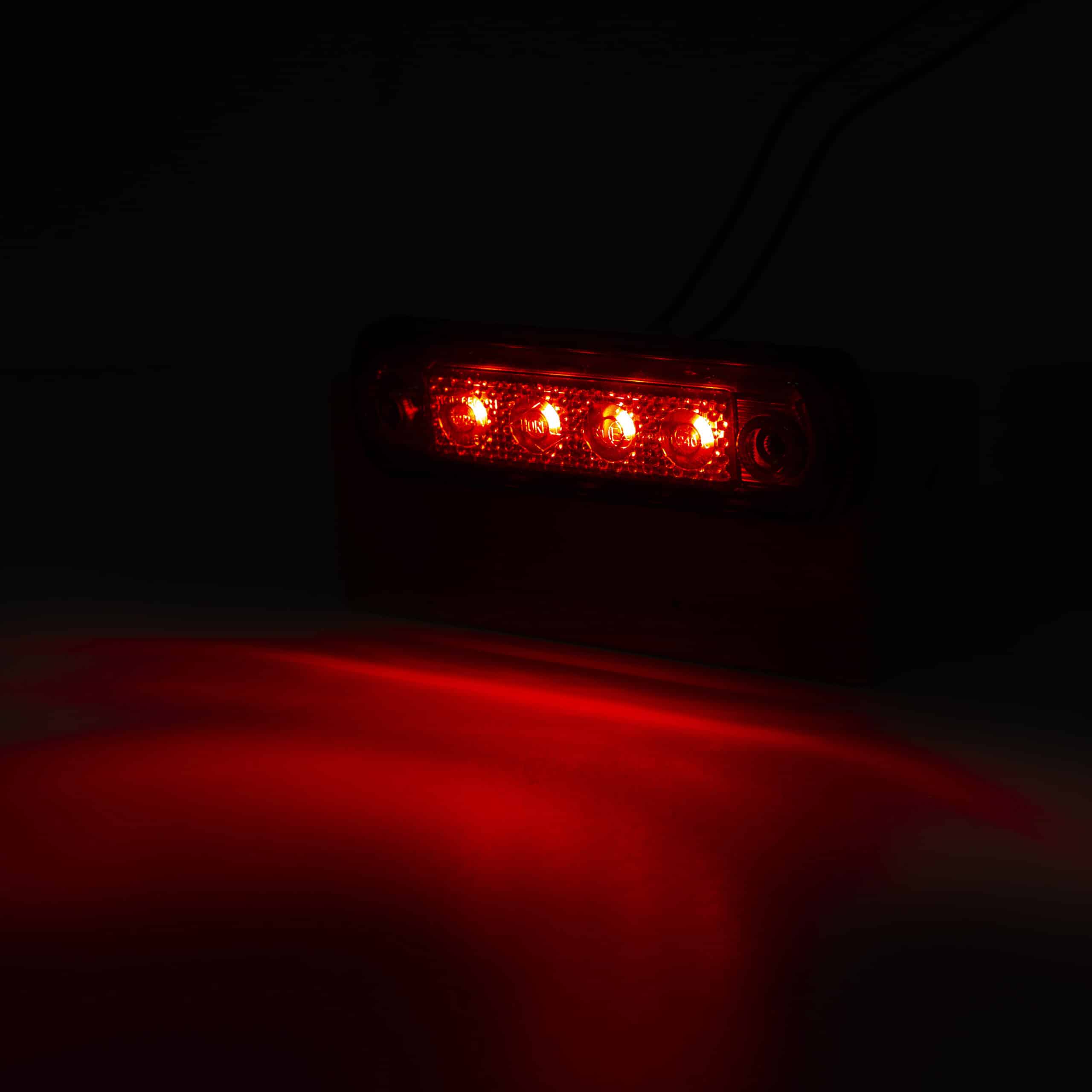 Die rote Positionsleuchte dient auch als Reflektor und erhöht die Sichtbarkeit des Fahrzeugs sowohl im aktiven als auch im passiven Beleuchtungsmodus. Das integrierte 25 cm lange Kabel mit offenem Kabelende ermöglicht einen direkten Anschluss. Die Lampe erfüllt die Anforderungen von IP68, CE, ECE-R10 und ECE-R7, was zu ihrer Verwendbarkeit im professionellen Verkehr beiträgt.