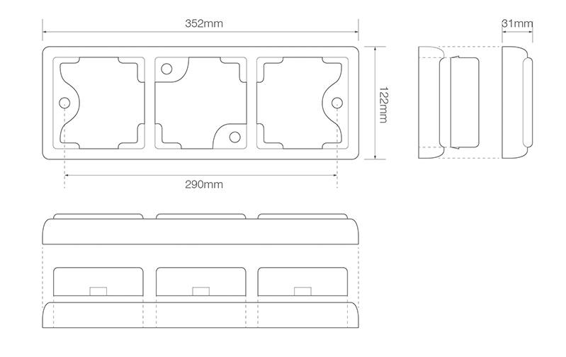 Das Gehäuse besteht aus ABS mit einer Acryllinse und ist staub- und wasserdicht gemäß IP67-Klassifizierung. Die Abmessungen betragen 350x120x31 mm. Die Aufbaumontage ermöglicht die Installation an verschiedenen Fahrzeugtypen. Dieses Modell entspricht den Richtlinien CE, ECE R10, ECE R6, ECE R7, ECE R23 und ECE R38.
