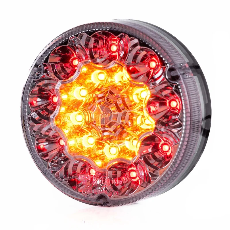 Dieses LED Rücklicht kombiniert die Funktionen: Rücklicht, Bremslicht und Blinklicht. Mit ihrer runden Größe von ø90 x 32 mm und der hellen Linse lässt sie sich leicht in eine Vielzahl von Fahrzeugdesigns integrieren. Das Rücklicht entspricht den Richtlinien CE, ECE R10, ECE R6 und ECE R7, die die elektromagnetische Verträglichkeit und die funktionale Sicherheit auf den europäischen Märkten gewährleisten.