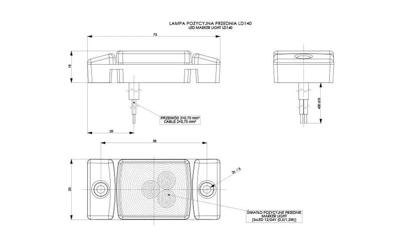Das kompakte Design (73 x 33 x 17,3 mm) und das 45 cm lange Verbindungskabel mit offenem Kabelende ermöglichen den Einbau in verschiedene Fahrzeuganwendungen. Diese Positionsleuchte strahlt eine weiße Lichtfarbe aus und ist nach CE, ECE-R10 und ECE-R7 zertifiziert. Die Schutzart IP68 gewährleistet Staubdichtigkeit und langfristige Wasserbeständigkeit.