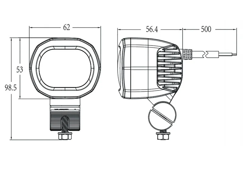 Das Gehäuse besteht aus aluminium mit einer stoßfesten Linse aus Polycarbonat, die vor äußeren Einflüssen schützt. Die Lampe verfügt über ein offenes Kabelende mit 50 cm Kabel für den direkten Anschluss. Dank der IP67-Klassifizierung ist der Arbeitsscheinwerfer staub- und wasserdicht. Darüber hinaus entspricht das Produkt den CE- und ECE-R10-Richtlinien, wodurch die elektromagnetische Verträglichkeit gewährleistet ist.